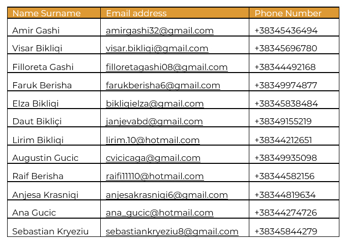 During the training, the participants learned in theory and practice the following topics: Concepts and types of tourist guides, Professional behavior and ethics of tourist guides, Itinerary/tourist path, Information regarding the Kosovo cultural heritage, Information regarding the Kosovo tourism law context, Research techniques for the update of the information for tourism in (Janjevë/Janjevo), Employment opportunities through tourism/tourism business, Networking and promotion of the profile of tourist guides in the Kosovo market, Practical hours in (Janjevë/Janjevo) as a tourist guide and site visit outside (Janjevë/Janjevo). The theoretical part of the training was held on the premises of the “Shtjefën Gjeçovi” school in (Janjevë/Janjevo), while the practical part was realized/practiced in (Janjevë/Janjevo), (Prishtinë/Priština), (Novobërdë/Novo Brdo), Prizren, (Dranoc/Drenovac) and (Gjakovë/Djakovica). As a result of the training, we have certified 12 participants who have basic knowledge, and if you have decided to visit (Janjevë/Janjevo) then you can always contact the people following the order in this list.